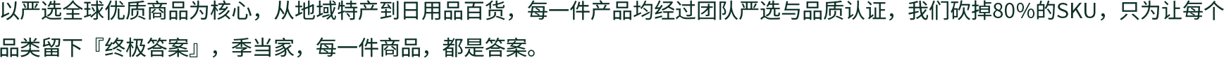 以严选全球优质商品为核心,从地域特产到日用品百货,每一件产品均经过团队严选与品质认证,我们砍掉80%的SKU,只为让每个品类留下【终极答案】,季当家,每一件商品,都是答案。