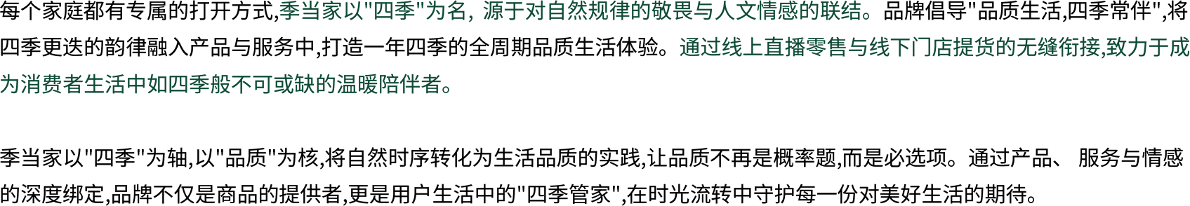 季当家以【优选品质,四季如一】为愿景,构建线上线下联动的新型消费生态圈。通过直播电商的即时互动与线下门店的沉浸式体验,打造【所见即所得】的消费场景,让用户在每一季都能发现生活的品质细节。